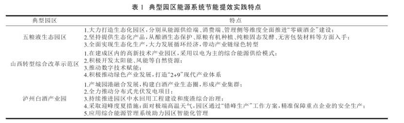 園區(qū)在推動我國實體經(jīng)濟發(fā)展和城鎮(zhèn)化發(fā)展中發(fā)揮了關鍵作用,是支撐制造強國戰(zhàn)略的主戰(zhàn)場。有研究表明,園區(qū)二氧化碳排放量約占全國總排放量的31%[4],園區(qū)是資源能源消耗最集中的地方?,F(xiàn)階段,為了節(jié)約能源,保護環(huán)境,我國各級園區(qū)都在持續(xù)推動綠色低碳發(fā)展。田金平等研究指出我國工業(yè)園區(qū)節(jié)能提效實踐創(chuàng)新主要體現(xiàn)在以下5個方面: ①聚焦重點領域,全過程系統(tǒng)性推進節(jié)能工作。②集中式能源基礎設施升級改造,多樣化開發(fā)利用余熱、 余壓和能量多級利用。③積極利用可再生能源,推進能源結構轉型升級。④積極開展智慧能源探索,實現(xiàn)能源全過程精細化管理。⑤建立健全能源管理體系。表1為典型園區(qū)能源系統(tǒng)節(jié)能提效實踐特點。