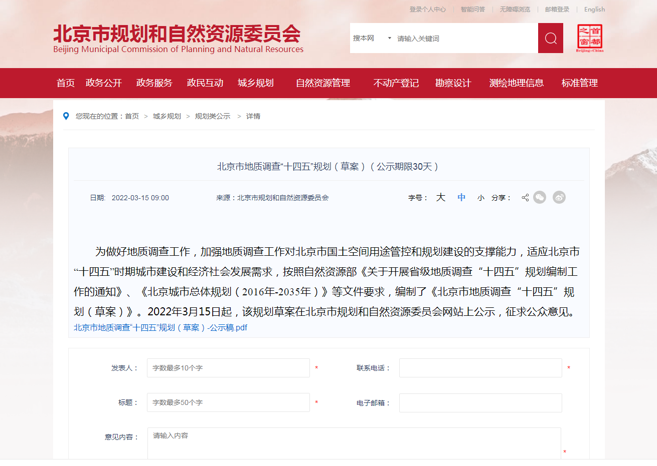 地大熱能地熱+多能互補網訊:《北京市地質調查“十四五”規(guī)劃(2021—2025年)(草案)》(以下簡稱《草案》)3月15日起在市規(guī)劃自然資源委網站公示,聽取公眾意見,公示期30天?!?a href="http://m.oulimei.cn/t/規(guī)劃.html" >規(guī)劃》提出,北京市將率先對首都功能核心區(qū)地熱能等開展綜合地質調查評價,提供地質安全保障。社會公眾對該《規(guī)劃》如有意見建議,可在4月14日前登錄北京市規(guī)劃自然資源委網站留言。