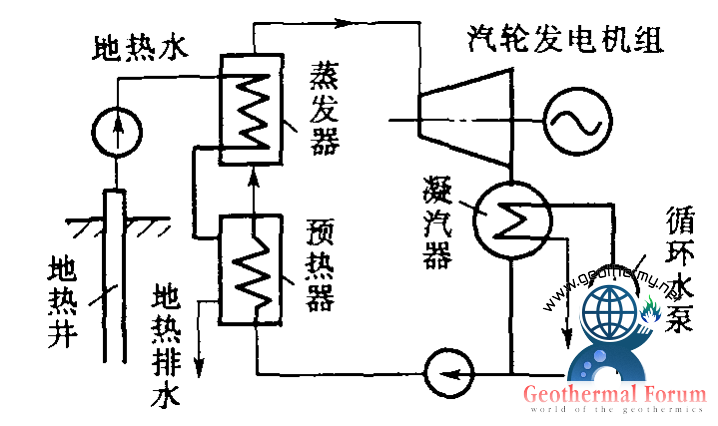 雙循環(huán)地?zé)岚l(fā)電系統(tǒng)是利用地下熱水來(lái)加熱某種低沸點(diǎn)工質(zhì),使其進(jìn)入汽輪機(jī)工作的地?zé)岚l(fā)電系統(tǒng),又稱中間介質(zhì)法或低沸點(diǎn)工質(zhì)循環(huán)。它是為克服閃蒸地?zé)岚l(fā)電系統(tǒng)的缺點(diǎn)而出現(xiàn)的一種循環(huán)系統(tǒng)。地下熱水用深井泵抽到地面進(jìn)入電站內(nèi)的蒸發(fā)器,加熱某一種低沸點(diǎn)介質(zhì)(如氟里昂11、氯乙烷等),使之變?yōu)榈头悬c(diǎn)介質(zhì)蒸氣,然后通入汽輪機(jī)做功發(fā)電,汽輪機(jī)排出的乏汽經(jīng)凝汽器冷凝成液體,用工質(zhì)泵再打回蒸發(fā)器重新加熱,循環(huán)使用。為充分利用地?zé)崴?/a>的余熱,讓從蒸發(fā)器排出的地?zé)崴?/a>經(jīng)過一個(gè)預(yù)熱器先預(yù)熱來(lái)自凝汽器的低沸點(diǎn)工質(zhì)液體,使其溫度上升至接近蒸發(fā)器內(nèi)的工質(zhì)飽和溫度,再進(jìn)入蒸發(fā)器。為了保證從地?zé)峋?/a>來(lái)的地?zé)?/a>水在輸送過程中不閃蒸成蒸氣和不使溶解氣體從水中逸出,在管路中的熱水始終保持超過其溫度對(duì)應(yīng)的飽和壓力。