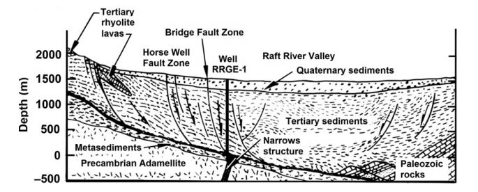 拉夫特河地?zé)崽?/a>的熱儲層,處在一個盆地中,這個盆地西部以一個小角度的斷層為界限,東邊則是由黑松山(Black Pine Mountains)和一個二次斷層分界。熱儲的蓋層為第三系的沉積層,基底巖石大約厚度為1600m,在這個深度被一個東北向的線性構(gòu)造—解理構(gòu)造(Narrows Structure)所貫穿,人們認(rèn)為這個結(jié)構(gòu)是基底剪切作用產(chǎn)生的。熱源為前寒武紀(jì)二長花崗巖。開始,人們認(rèn)為熱液是通解理構(gòu)造涌上來,然后通過其他的褶皺和斷層蔓延整個沉積構(gòu)造。現(xiàn)在的人們則認(rèn)為有兩個熱源補(bǔ)給區(qū),一個來自西北方向沿著馬井?dāng)鄬臃植嫉难a(bǔ)給區(qū),另外一個則是來自東南方向的,可能是與變窄構(gòu)造有關(guān)聯(lián)。