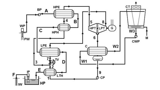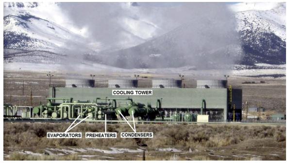 最新的USGeo拉夫特河發(fā)電站坐落在起初的電站南南東方向約600m的地方。這個最新的發(fā)電機(jī)組的能量對流系統(tǒng)是一個部分回?zé)?,二級,雙壓力雙循環(huán)發(fā)電機(jī)組。有兩個單獨(dú)的單元,每一個單元都有兩個軸向流動的渦輪來驅(qū)動同一個中心發(fā)電機(jī)。一個四室的水冷卻塔為殼管冷凝器(shell-and-tube condensers)提供冷卻提供冷卻水。補(bǔ)充水是從水井中獲取的,而且需要及時處理來維持冷卻塔中的水的質(zhì)量。138℃的鹵水以大約3.15×106kg/s的速度泵向蒸發(fā)器和預(yù)熱器,循環(huán)工質(zhì)異戊烷(i-C5H12)就是在蒸發(fā)器和預(yù)熱器中吸收溫度的。換熱器只在高壓循環(huán)中才使用。