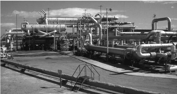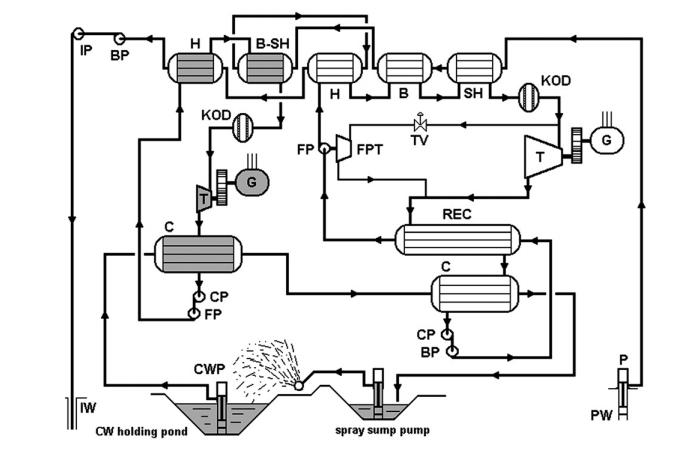 起初的電站使用的就是普通的雙循環(huán)地?zé)岚l(fā)電流程的機(jī)組。在優(yōu)化了1979年開始使用的發(fā)電機(jī)組以后,修整后的地?zé)犭娬臼且粋€完全不同的發(fā)電機(jī)組。以前的主渦輪機(jī)、真回流熱電轉(zhuǎn)換器、和交互蘭金循環(huán)都被還掉了。取而代之的是,一個簡單的,非提取異丁烷渦輪,和九個更大的鹵水熱電交換機(jī)。在熱電交換機(jī)的管道所在的一邊是鹵水,在殼側(cè)是碳水化合物。驅(qū)動沸騰給水渦輪的異丁烷來自于一個單獨(dú)的過熱器的側(cè)流。發(fā)電系統(tǒng)上安裝了一個降壓閥,來降低異丁烷的壓力以適應(yīng)BFPT的注入壓力。換熱器沒有更換,但是現(xiàn)在只是作為一個異丁烷循環(huán)的預(yù)熱器。丙烷循環(huán)現(xiàn)在也已經(jīng)獨(dú)立于異丁烷循環(huán)。