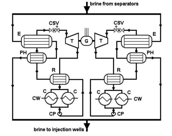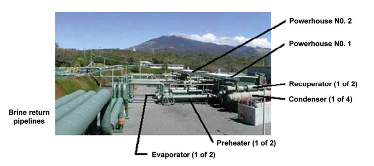 米拉瓦列斯的五號(hào)發(fā)電機(jī)組是2004年剛投入使用的。這個(gè)發(fā)電機(jī)利用從一號(hào)和二號(hào)和三號(hào)發(fā)電機(jī)組中的廢棄鹵水,通過(guò)注入井來(lái)獲取了可能回到熱儲(chǔ)層中的能量??偣驳陌l(fā)電量是15.5MW,發(fā)電機(jī)組中的每一個(gè)發(fā)電單元都發(fā)出7.75MW的電。每一個(gè)發(fā)電單元是有兩個(gè)渦輪組成的,驅(qū)動(dòng)同一個(gè)發(fā)電機(jī)。循環(huán)工質(zhì)是常規(guī)的正戊烷,C5H12。每一個(gè)單元用兩個(gè)預(yù)熱器。兩個(gè)蒸發(fā)器跟他們各自的分隔板。兩個(gè)回?zé)崞?,四個(gè)水冷凝器。這個(gè)發(fā)電機(jī)組是有澳瑪特(Ormat)提供的。