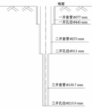 如圖所示,該孔采用三開(kāi)結(jié)構(gòu),一開(kāi)0~30m,井徑為445mm;二開(kāi)30~500m,井徑311mm;三開(kāi)500~350 m,井徑215.9mm。0~ 30m下入Φ377mm護(hù)壁管;0~500m下入Φ273mm套管作為出水管及泵室管;500~3500m下入Φ139.7mm套管作為出水管及濾水管。