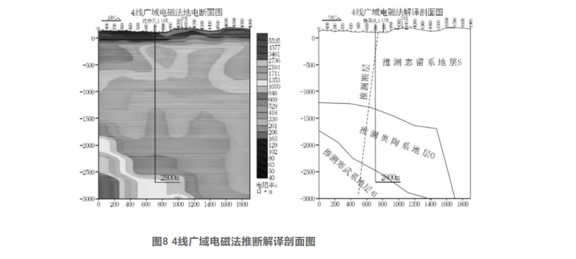(3)各地層厚度及電阻率特征,志留系(S)地層電阻基本小于500Ω·m,厚度900-1800m;奧陶系O地層電阻率400~900Ω·m,厚度大于300 m,向南西側厚度急劇增大;寒武系∈地層電阻率基本大于900Ω·m,根據(jù)斷裂構造發(fā)育、裂隙發(fā)育等因素影響呈現(xiàn)不同電阻率,厚度未揭穿。