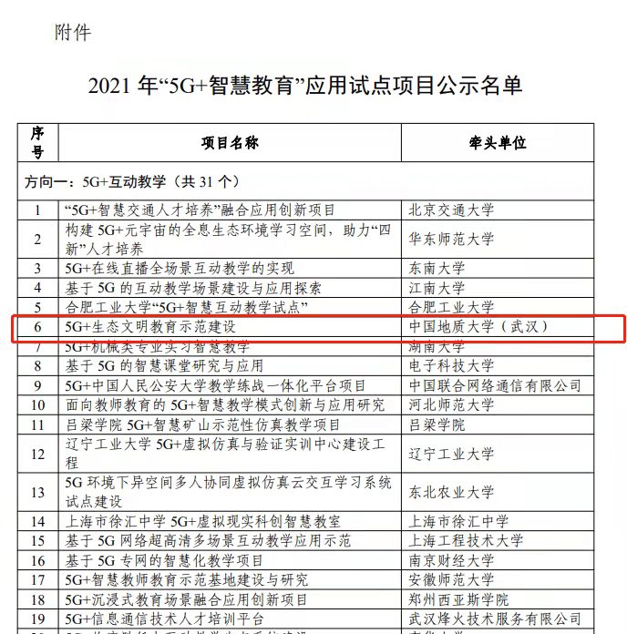 地大新聞網(wǎng)訊:近日,工業(yè)和信息化部、教育部聯(lián)合公示2021年“5G+智慧教育”應(yīng)用試點(diǎn)項(xiàng)目入圍名單,我校牽頭申報(bào)的“5G+生態(tài)文明教育示范建設(shè)”項(xiàng)目成功入選?!?G+智慧教育”應(yīng)用試點(diǎn)項(xiàng)目是工業(yè)和信息化部、教育部為貫徹落實(shí)黨中央、國(guó)務(wù)院關(guān)于加快5G發(fā)展、加強(qiáng)教育信息化工作的決策部署,旨在遴選一批利用5G網(wǎng)絡(luò)的教育信息化最佳實(shí)踐和解決方案,推進(jìn)5G與教育的雙向賦能和融合創(chuàng)新,推動(dòng)教育模式變革和教育生
