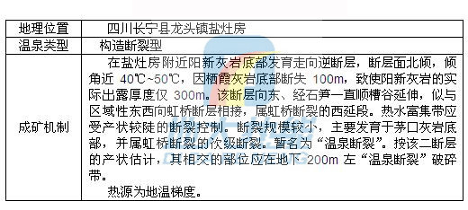 四川長寧竹海溫泉風景竹海溫泉位于四川長寧縣龍頭鎮(zhèn)鹽灶房,因溫泉水水溫達39.5℃,富含微量元素和特殊的氣體組分,可定名為硫化氫礦泉,浴用具有特殊醫(yī)療效果,屬發(fā)展溫泉旅游業(yè)的寶貴資源。1994年7月在溫泉旁的長寧化工廠施工1#及2#供水孔時,意外地在1#孔60m深處揭露熱水,水溫達38.5e,估計流量約2000m3/d。1996年7月在根據(jù)熱異常及放射性r異常確定的3#孔位處,于80m深處又鉆遇42℃熱水。